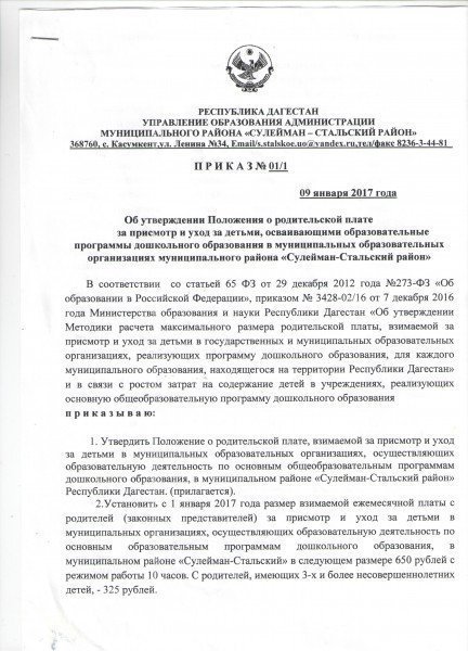 Документ об установлении размера платы, взимаемой с родителей (законных представителей)